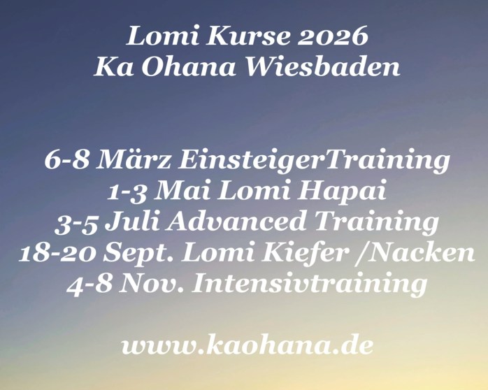 Lomi Einsteigertaining 06. bis 08. März 2026 Du möchtest die Lomi Kahuna Bodywork kennenlernen, den ersten Einstieg machen oder herausfinden ob die Lomi genau das richtige für dich ist? Dafür ist diese 3 Tages- Training bestens geeignet. Wir werden die Grundtechniken der Lomi kennenlernen,…